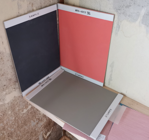 そんな色彩決定のプロセスの中で、写真にあるような塗装サンプル(A4サイズの塗り見本。指定した色番号通りにほぼどんな色でも作ってくれる)はとても貴重で、このサンプルから得られる情報は沢山あります。